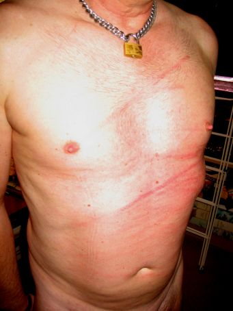 This pic was taken 29th June 2003. Implements used were my heavy flogger, a four-tailed ship and my single-tail horsewhip. I think about thirty strokes. Shame I was sweating - made the flash burn out! We had to stop due to the weal across my ribs - we both though the skin was going to break - and it probably would have. Never been whipped that hard on my front before! Very painful and very horny!