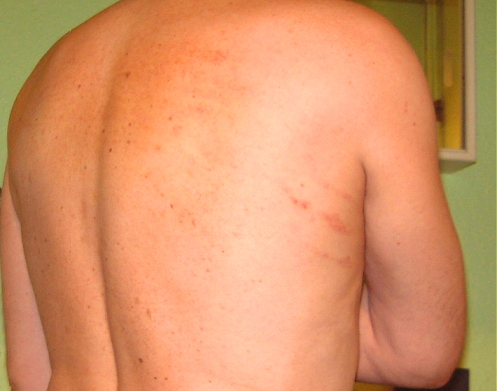 This pic was taken on 16th June 2002, 25 hours after a whipping from Bob at 31 Club. I very rarely mark but you can just see the yellowish bruising on my back and also a few marks where the single-tail horsewip went slightly astray.