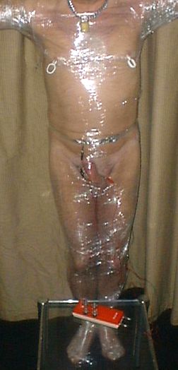 My arms are attached to chains on the wall. Owing to the sensory deprivation caused by the cling-film wrap the tit-clips, attached through small holes in the film, seem to have a greater sensation than usual.