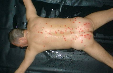 My arms and legs are attched to chains on the wall. You can see that my butt has been well caned or paddled and the red blobs are candle wax. You know what the liquid on the floor is!